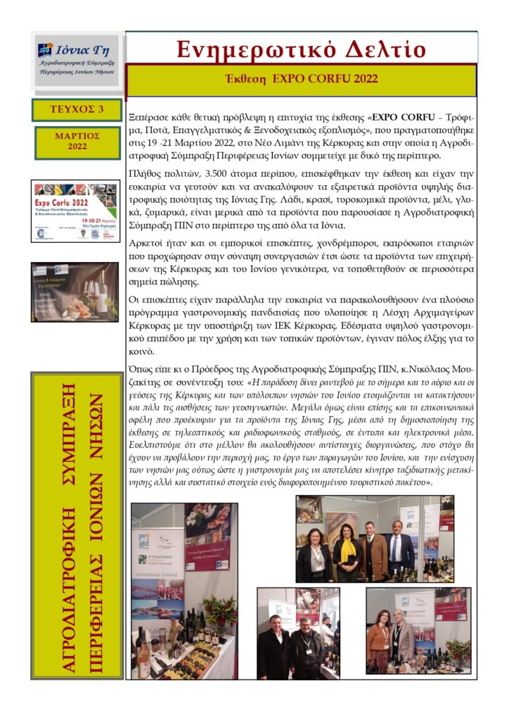 H συμμετοχή της Περιφέρειας Ιονίων Νήσων, του Περιφερειακού Ταμείου Ανάπτυξης, της Λέσχης Αρχιμαγείρων Κέρκυρας και παραγωγών της Ιόνιας Γης στην έκθεση ποτών και τροφίμων Foodexpo 2022.